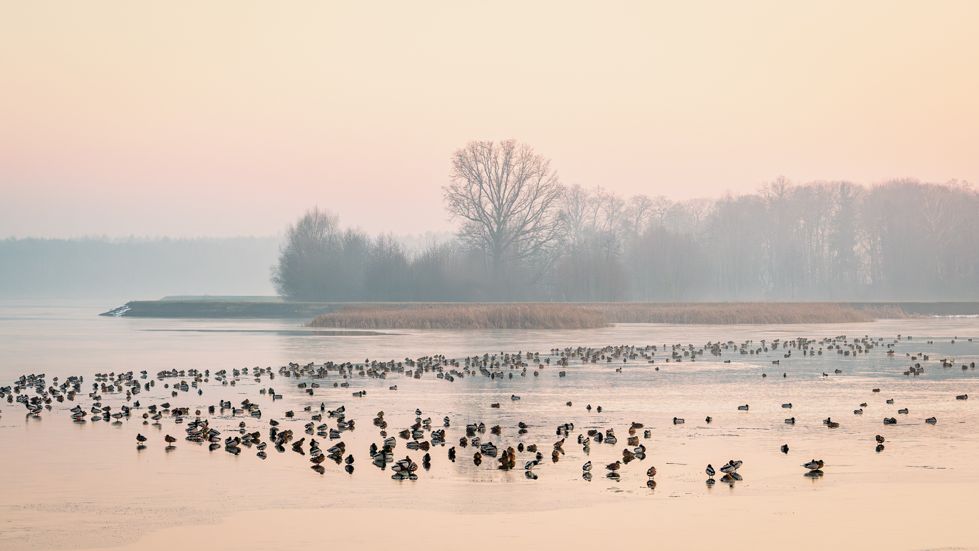 The composition conveys this seasonal duality by juxtaposing the ducks’ activity with the icy expanse. Their clustered forms lead the eye across the frame. A mid-range lens (65 mm) compressed the scene slightly, emphasizing the density of the flock while retaining environmental context. The soft, diffused light of early morning preserved subtle details in both the ice and birds. A narrow aperture (f/5,6) ensured sharpness throughout. Post-processing gently enhanced the pastel tones in the sky. I also enhanced the contrast between the ducks’ dark silhouettes and the ice’s muted blues.