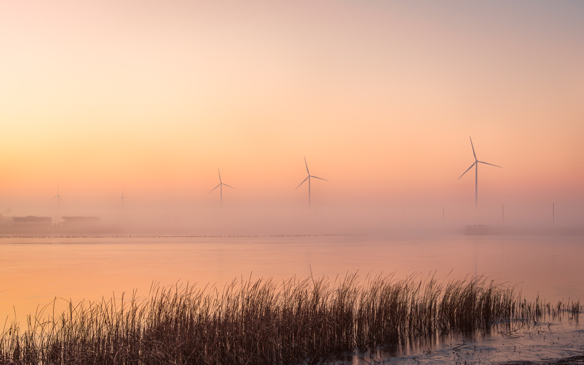 Wind turbines rise from morning mist in a glowing pink sunrise