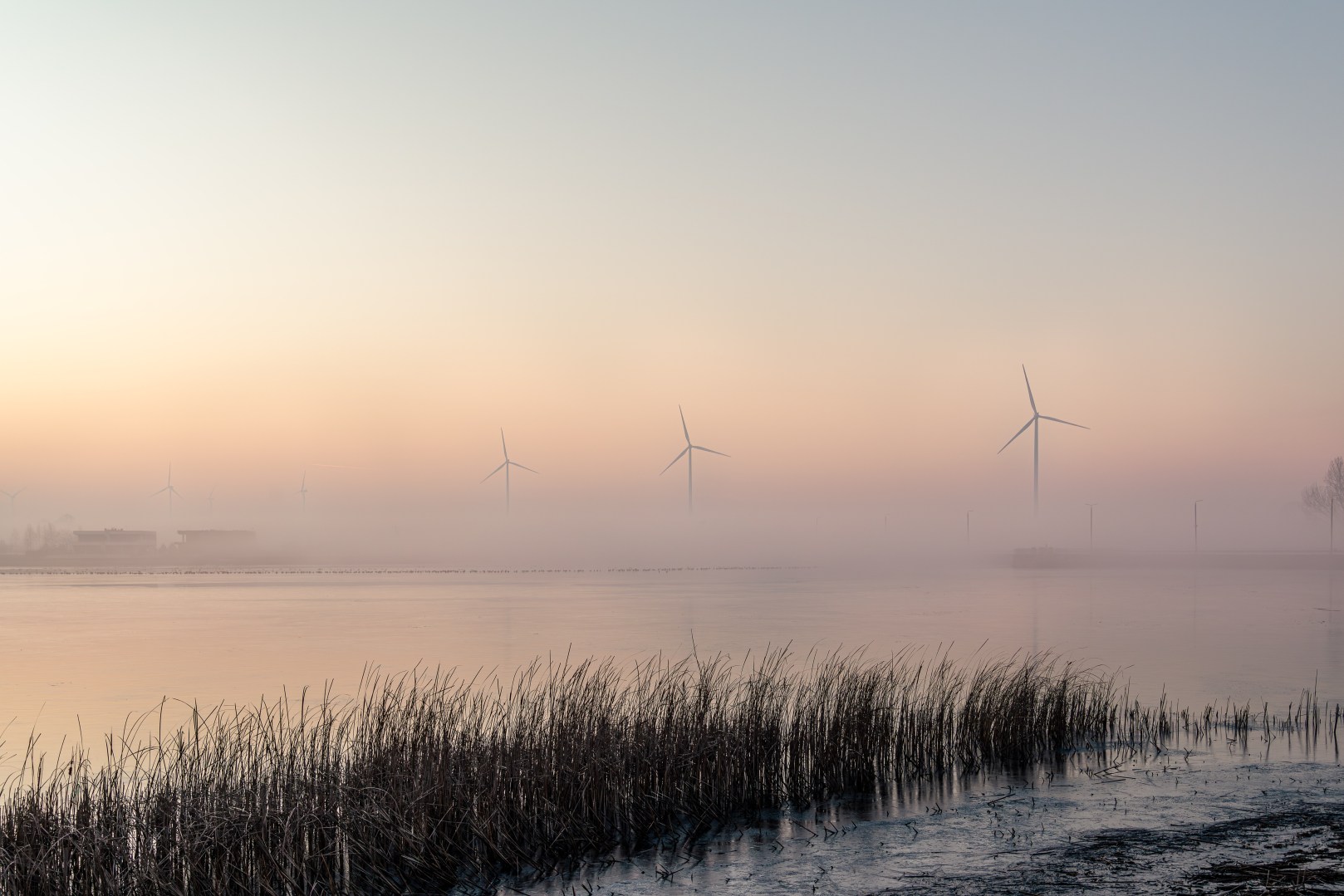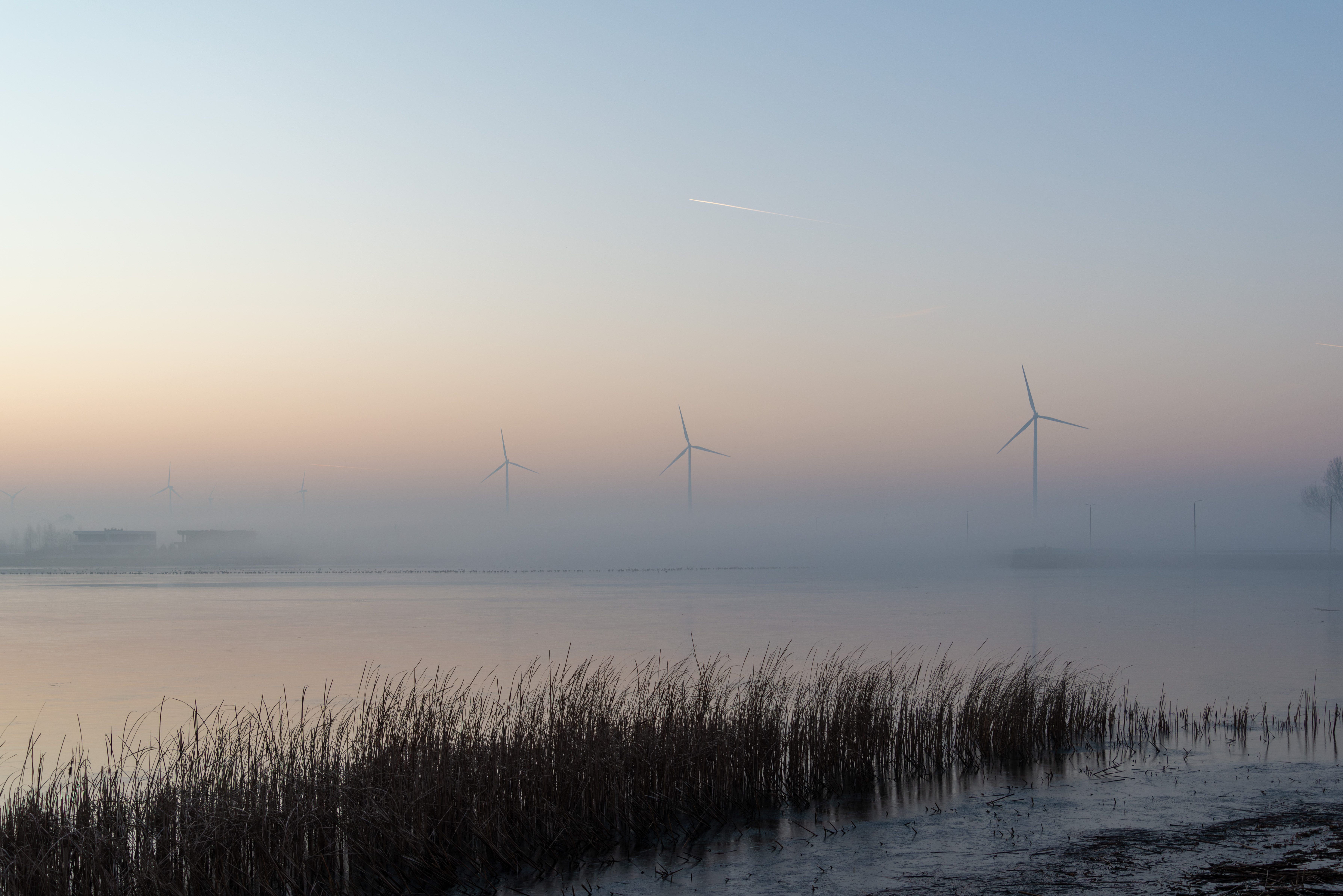 I ‘painted’ light onto the turbines (Dodge: Highlights, 10%) and deepened shadows in the reeds (Burn: Shadows, 8%) to mimic how sunlight slices through fog.